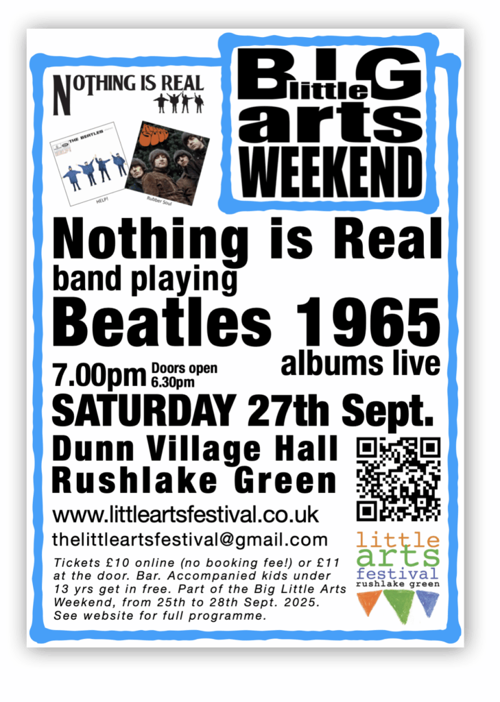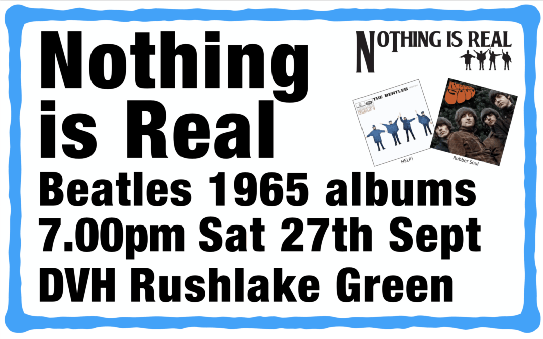 Tickets to see Nothing is Real play The Beatles’ 1969 albums Help! and Rubber Soul, on Sat 27th Sept, in the Dunn Village Hall, are selling fast online. It’s £10 in advance and £11 at the door. Booking is super easy. Here’s a link: